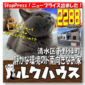 ルクハウスが販売中の清水区下野緑町「静かな環境のド南向きなお家」、ニュープライスが2288万円からとなりましたぁぁぁぁ!
